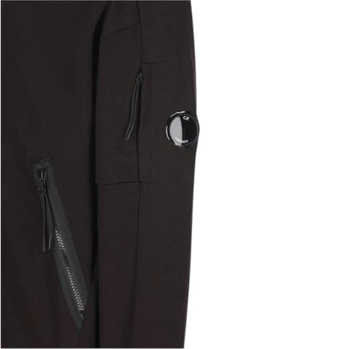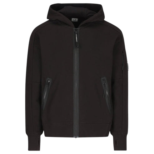 The CP Company Hooded Sweatshirt features a zip closure and is made of 100% cotton. It comes in the colour black and has side zip pockets, ribbed cuffs and hem, and a lens patch pocket on the arm.