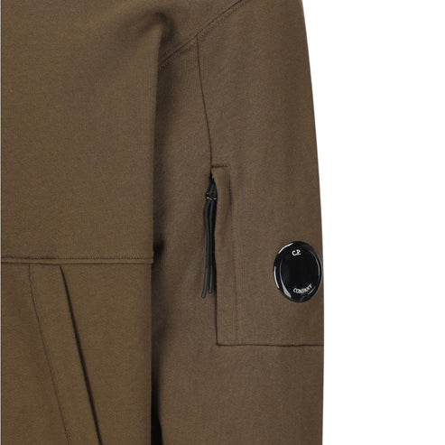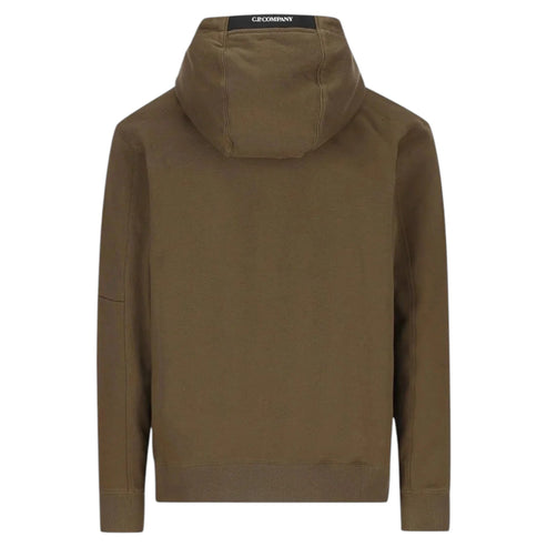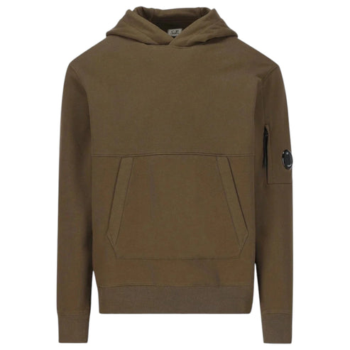 CP Company's green hoodie, crafted from 100% brushed cotton fleece. Its unique design includes a patch pocket and the signature CP Company lens on the arm, while the ribbed cuffs and hem provide a comfortable and stylish fit. Elevate your wardrobe with this timeless and versatile piece.