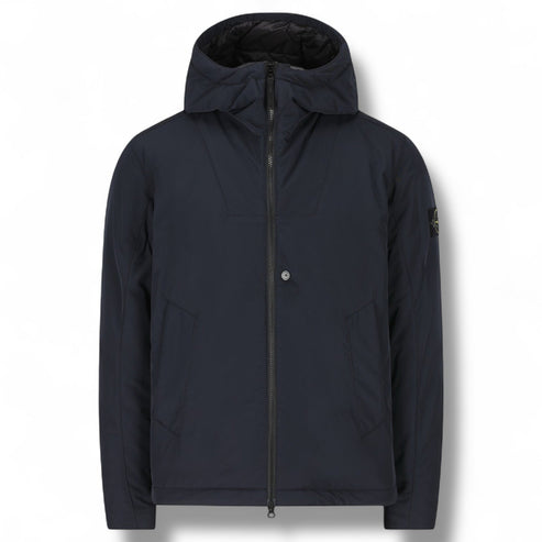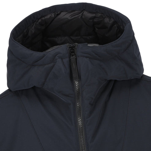 New for Autumn Winter 2025, this padded hooded jacket in navy features polyester micro twill with a spring-like, helical molecular structure for a soft feel and rich colours. Insulated with PrimaLoft® Gold P.U.R.E™, a 100% recycled fibre blend, it delivers outstanding warmth-to-weight performance. The jacket’s advanced padding ensures superior thermal efficiency, while its anti-drop treatment enhances durability and moisture resistance