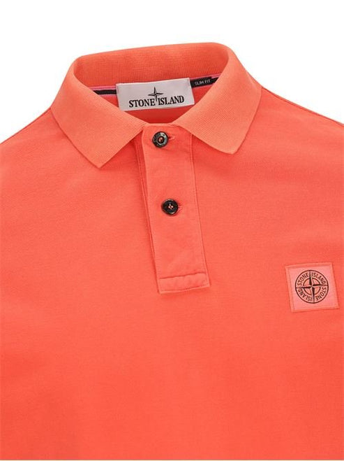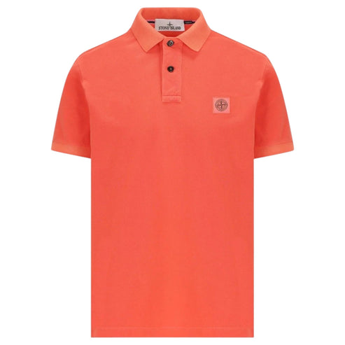Stone Island Papaya Polo Shirt. Made from organic cotton and elastane piqué, this slim fit shirt offers both comfort and style. Featuring a two-button fastening and the iconic Stone Island Compass logo patch, this piece is a must-have for the spring/summer season of 2025.